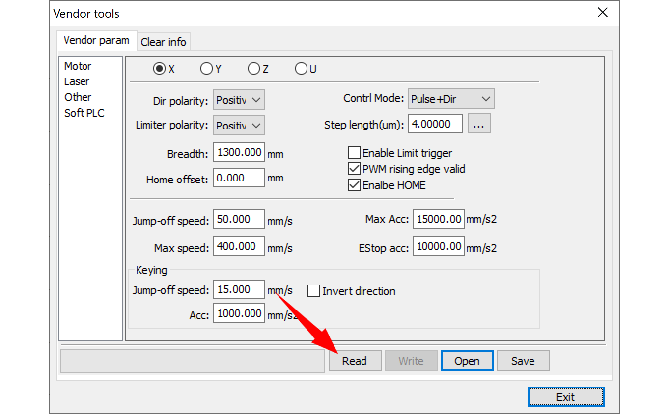 - Read settings from the laser machine – Click on Read button to get settings from the laser machine first.