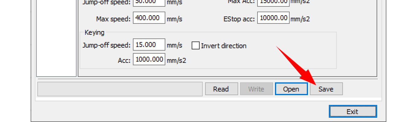 - Back up current settings – Click on Save button to back up current settings, which can be used to restore the laser machine from a mess.