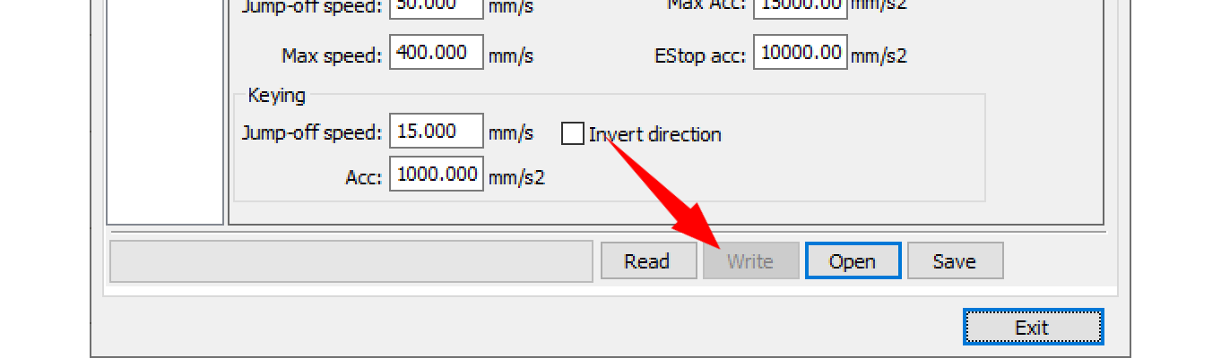 TIPS: Click on Save button to back up current settings to a file. Having a backup file is always a good practice, especially when you update control card after a mess. - Write settings to the laser machine – Click on Write button to send settings to the laser machine.